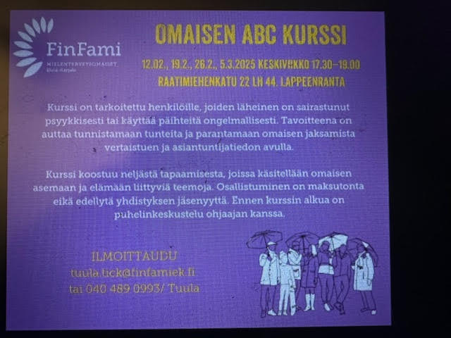 - 23.11 Yhteisöllinen päivä, Alkaen klo 11 FinFamin toimistolla Raatimiehenkatu 22 LH 44, Lappeenranta. Kts. mainos alla. Ilmoittautuminen Marille.