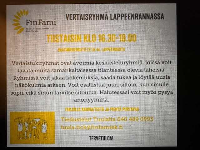 - Tiistaisin klo 16:30-18 Lappeenrannan vertaisryhmä – Raatimiehenkatu 22:ssa toimitiloissamme