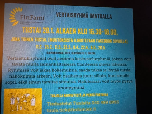 - Tiistaisin Imatran Vertaisilta joka toinen viikko 3.12. asti, (pariton viikko) Imatran seurakunnan Olavinkulman Lyhty-tilassa klo 16:30-18