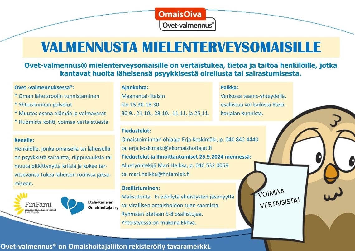 - Mielenterveysovet- koulutus yhteistyössä Etelä-Karjalan omaishoitajat ry:n kanssa 21.10.; 28.10.; 28.11.; 11.11. ja 25.11. klo